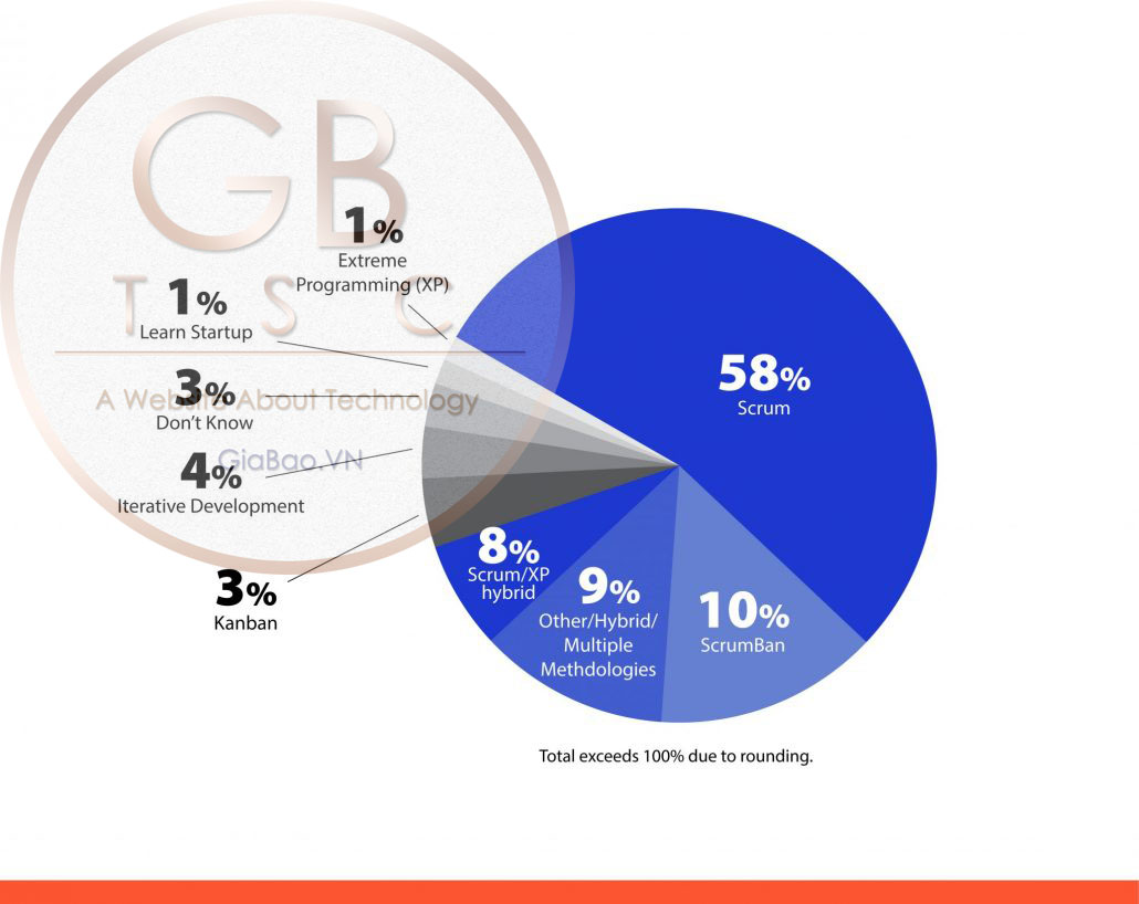 Có thể nhận thấy, trong số các phương pháp Agile, Scrum thuộc loại phổ biến nhất bởi sự hiệu quả và tối ưu của nó. Theo khảo sát ở trên, Scrum và các phương pháp lai với Scrum như Scrumban, Scrum và XP chiếm gần ¾ mức độ phổ biến. Đó là lí do rất nhiều nhóm bắt đầu quá trình tiếp nhận Agile với việc sử dụng Scrum.